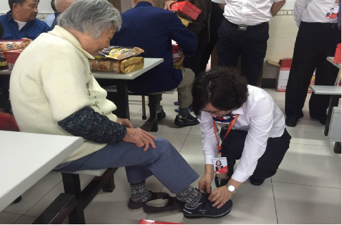 活動(dòng)當(dāng)天,志愿者們帶著面包、芝麻糊等節(jié)日慰問品走進(jìn)福利院,還為老人們送上了健步鞋。由于事先問好了尺碼,志愿者幫助老人們?cè)嚧r(shí),鞋子都十分合腳??粗鵁釤狒[鬧、人來(lái)人往的飯?zhí)?,福利院的王阿姨樂得直拍手,不住地?duì)志愿者們說道,“謝謝哦,小姑娘你們想得真周到?!狈炙屯甓Y物,志愿者們或是和老人們拉起家常,聊聊生活趣事,或是攙著老人一起遛彎,參觀他們?nèi)粘5钠鹁迎h(huán)境,詢問生活上的需求。