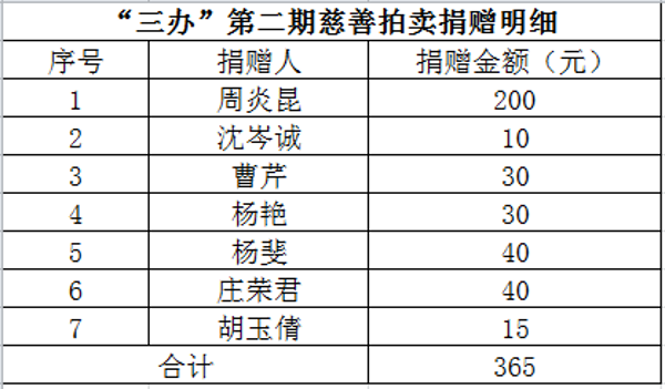 ? ? 昆山農(nóng)商銀行黨辦、董辦、行政辦(以下簡稱“三辦”)于10月28日下午牽頭組織開展了第二期“三辦”慈善拍賣會,拍賣款項全部捐至昆山農(nóng)商銀行慈善基金會,以推進社會慈善公益事業(yè)發(fā)展,具體捐贈明細如下: