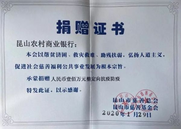 昆山農(nóng)商銀行慈善基金會(huì)捐贈(zèng)100萬元援助疫情防控