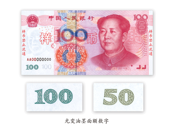 觀察方式:第五套人民幣100元和50元正面左下角的面額數(shù)字“100”和“50”是使用光變油墨印制的。垂直觀察票面,“100”呈現(xiàn)綠色,“50”呈現(xiàn)金色;當傾斜票面觀察時,“100”變?yōu)樗{色,“50”變?yōu)榫G色。