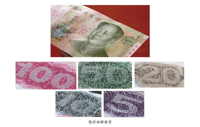 第五套人民幣從1元券到100元券的正面右上角面額數(shù)字下的團(tuán)花內(nèi)隱藏著利用隱形圖文技術(shù)制作的面額數(shù)字。