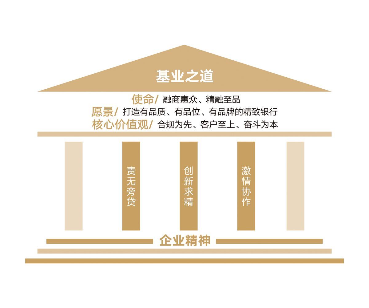 昆山農(nóng)商行的企業(yè)文化,植根于地域人文、區(qū)域經(jīng)濟(jì),融合了管理層的領(lǐng)導(dǎo)思想和員工的行為事跡,蘊(yùn)含了豐富的文化元素,最終形成了“三品一精”的文化理念體系。即以“融商惠眾 精融至品”為使命,以“打造有品質(zhì)、有品位、有品牌的精致銀行”為愿景,遵循“合規(guī)為先、客戶至上、奮斗為本”的核心價(jià)值觀,弘揚(yáng)“責(zé)無(wú)旁貸、創(chuàng)新求精、激情協(xié)作”的企業(yè)精神。文化理念體系為基業(yè)之道的建設(shè)提供了理論基礎(chǔ),也表達(dá)了昆山農(nóng)商行人建設(shè)精致銀行的決心。